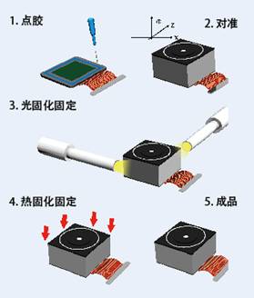 2 、 Dymax 戴馬斯的新技術(shù): 低溫熱固化技術(shù),主要應用于攝像頭組裝的主動對焦制程 (Active Alignment) 膠粘劑中。攝像頭的鏡座與電路板組裝過程中引進主動對焦制程可有效解決產(chǎn)品良率的問題。用于確定鏡頭和濾光鏡片之間的最佳位置,使鏡頭在整個圖像平面將產(chǎn)生最佳聚焦的質(zhì)量。在使用光固化零部件之前,先對鏡頭進行三維調(diào)整,測量最佳位置,再通過光照和加熱完成最終的固化。
