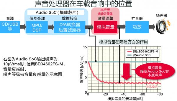 另一方面,音響用SoC*4)作為車載音響的核心,隨著制造工藝的微細(xì)化發(fā)展而呈現(xiàn)低電壓趨勢(shì),可處理的音頻信號(hào)變小,本底噪聲相對(duì)增加。這個(gè)課題的解決方法要求在SoC的后段具備低噪聲且高音質(zhì)的模擬音量。