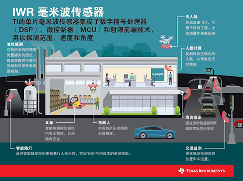 為了應(yīng)對工廠、樓宇自動化系統(tǒng)和智能基礎(chǔ)設(shè)施中對于更高效率的需求,開發(fā)人員現(xiàn)在能夠充分利用TI的智能化且穩(wěn)健耐用的毫米波傳感器產(chǎn)品組合。此外,在一些需求不斷增長的應(yīng)用領(lǐng)域,如醫(yī)療設(shè)備、箱內(nèi)液位感測、機(jī)器人視覺和無人機(jī)等,這項感測技術(shù)可用于改造現(xiàn)有的一些功能。TI的IWR1x 毫米波非接觸式傳感器不受環(huán)境中的光照、降雨、灰塵、下霧或霜凍的影響,這使它們在室內(nèi)或室外都能穩(wěn)健運(yùn)行。通過確定設(shè)備周圍物體的所處范圍、速率和角度,這些傳感器能立即適應(yīng)動態(tài)變化的場景。