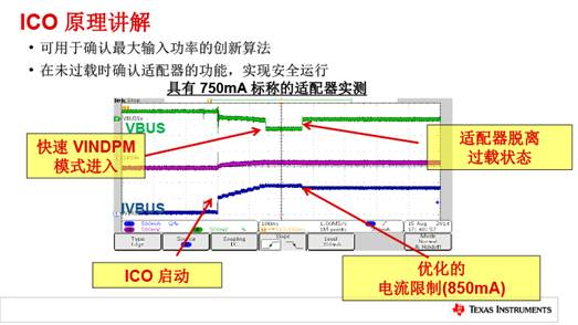 下圖可以清楚的了解到ICO的工作原理:綠線為T(mén)I的VBus,接入電池后開(kāi)始充電,此時(shí)ICO模式作為較小的電流監(jiān)測(cè)。當(dāng)電流逐漸上調(diào)后,VBus電壓下掉,同時(shí)保持在此模式下。這時(shí),VEDPM模式啟動(dòng),但此時(shí)的適配器事實(shí)上已經(jīng)過(guò)載,由于VEDPM功能的保護(hù),適配器在發(fā)燙的情況下仍在工作。通過(guò)ICO的監(jiān)測(cè)和優(yōu)化后,適配器脫離過(guò)載狀態(tài),可實(shí)現(xiàn)安全運(yùn)行。