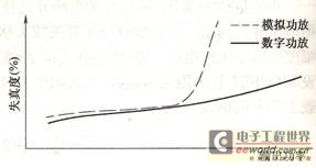 圖1 全數(shù)字功放與普通功放過(guò)載失真度比較