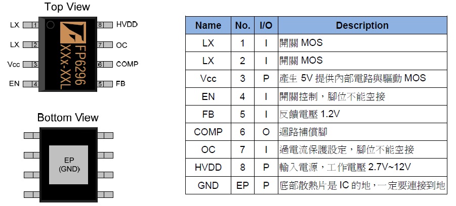 FP6296是一顆電流控制模式升壓轉(zhuǎn)換器,脈波寬度調(diào)變(PWM),內(nèi)置15mΩ/10A/14VMOSFET,能做大功率高轉(zhuǎn)換效率,周邊元件少節(jié)省空間,適合用在行動裝置,寬工作電壓2.7V~12V,單節(jié)與雙節(jié)鋰電池都能使用,精準反饋電壓1.2V(±2%),過電流保護透過外部電阻調(diào)整,電流控制模式讓暫態(tài)響應與系統(tǒng)穩(wěn)定性佳,輕載進入省電模式(Skip Mode),達到輕載高效率,封裝為SOP-8L(EP)。