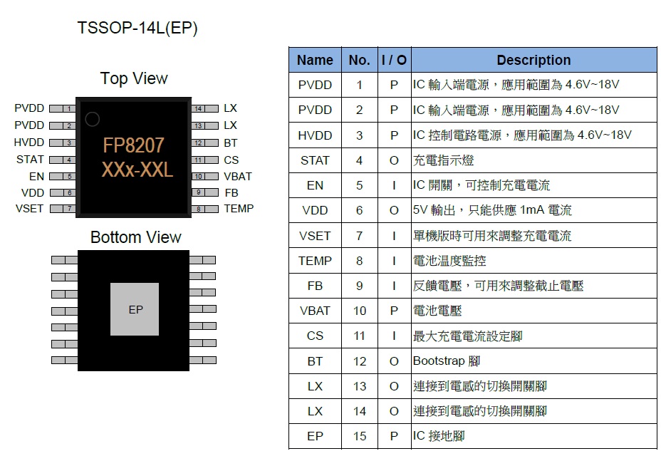 FP8207 是一款開關(guān)模式的電池充電控制器,輸入電壓應(yīng)用範(fàn)圍為4.6V~18V,可對(duì)單節(jié)或是多節(jié)鋰離子電池(最多三節(jié))進(jìn)行定電流或是恒壓充電,其最大充電電流為3A,可用外部電阻進(jìn)行設(shè)定,在充電方面細(xì)分成3 種模式,包含了涓流模式、定電流模式與定電壓模式,另有第三個(gè)控制回路可對(duì)來自電源轉(zhuǎn)接器的輸入電流進(jìn)行限制,這可保證讓系統(tǒng)持續(xù)工作的同時(shí)還能讓電池以最高速率進(jìn)行充電,但卻不會(huì)超出電源供應(yīng)器的能力。FP8207 集成了多項(xiàng)保護(hù)機(jī)制,包含了內(nèi)置輸入欠壓保護(hù)、輸入過壓保護(hù)、芯片過溫保護(hù)、電池短路保護(hù)、電池溫度監(jiān)控。