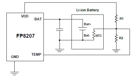 將TEMP 腳接到電池的NTC(負(fù)溫度係數(shù)熱敏電阻)傳感器的輸出端,若TEMP 腳的電壓小於VDD的45%或者大於VDD 的80%,代表著電池溫度過低或過高,充電將會(huì)停止,直接將TEMP 腳接地將會(huì)把電池溫度監(jiān)控功能取消。