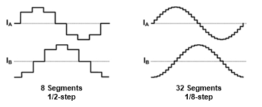 通常,步進電機不是由模擬線性放大器驅(qū)動;而是由PWM電流調(diào)節(jié)驅(qū)動,把線性的正弦波信號轉(zhuǎn)換成了離散的直線段信號。 正弦波可被分成多段,隨著段數(shù)的增加,波形不斷接近正弦波。 實際應用中,段數(shù)多從4到2048或更多,大多數(shù)步進驅(qū)動IC采用4到64段細分。整步驅(qū)動,每一時刻只有一個相通電,兩相電流交替和電流方向切換,使得一共產(chǎn)生四個步進電機機械狀態(tài)。半步驅(qū)動,比整步驅(qū)動方式相對復雜一些,在同一時刻,可能兩個相都需要被通電,如圖1所示,使電機的步進分辨率提高了一倍。細分驅(qū)動,電機轉(zhuǎn)子走一步的角度將會隨著細分數(shù)的增加而減小,電機轉(zhuǎn)動也越來越平穩(wěn),例如把一個32段細分序列稱為八分之一步驅(qū)動模式(見圖1)。