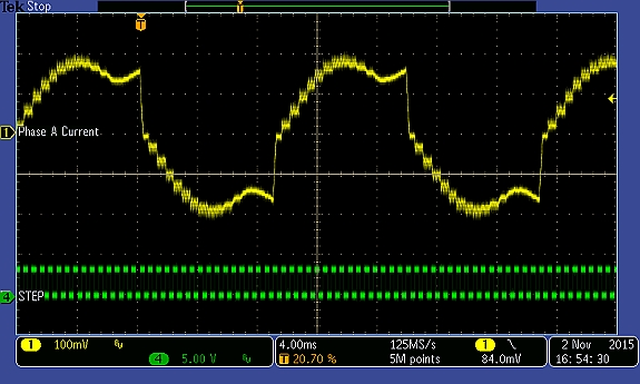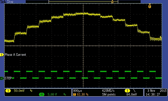 接著,在相同設置和試驗條件下,用市面上通用的雙極步進驅(qū)動器來驅(qū)動電機,采用傳統(tǒng)的峰值電流控制和使用外部檢測電阻器。該驅(qū)動器電流增大時采用慢衰減模式,電流減小采用混合衰減模式。