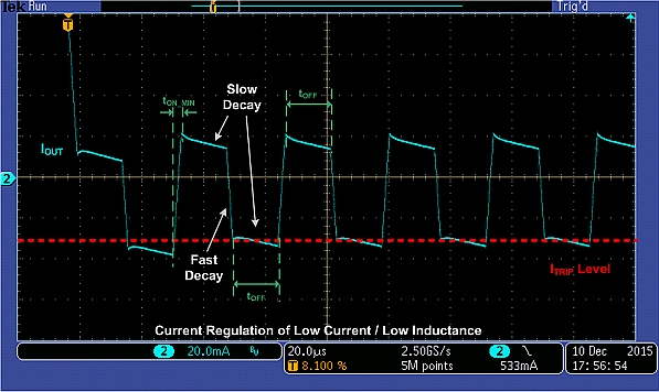 如果電源電壓高,電感值低,或所需的峰值電流幅值很低,電流很有可能高于設定值。由于blanking time,每個PWM周期都會有一個最小導通時間,此時許多傳統(tǒng)的步進電機驅(qū)動器無法控制繞組電流。如果發(fā)生這種情況,MP6500會不斷采用快衰退模式來保證繞組電流一直不超過設定值(見圖7)。