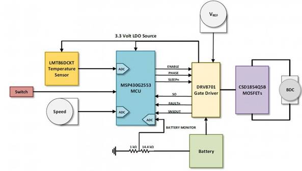 有刷式直流電機(jī)參考設(shè)計,由DRV8701柵極驅(qū)動器、MSP430G2553IPW20超低功耗微控制器、CSD18540Q5B60V N溝道MOSFET和LMT86DCKT精密CMOS溫度傳感器等器件組成。