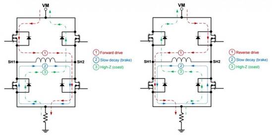 在有刷直流(BDC)電機(jī)中,可以使用一個簡單的脈寬調(diào)制(PWM)信號來控制該電機(jī)轉(zhuǎn)子的速度。由于PWM信號的占空比改變了傳送的平均電壓到電機(jī)是不同的,允許不同的轉(zhuǎn)子速度,而不會通過一個電阻電位器。然后使用兩相逆變器控制電機(jī)的方向這允許使用四個快速改變提供給電機(jī)的電流的方向獨(dú)立控制的MOSFET。如圖所示。
