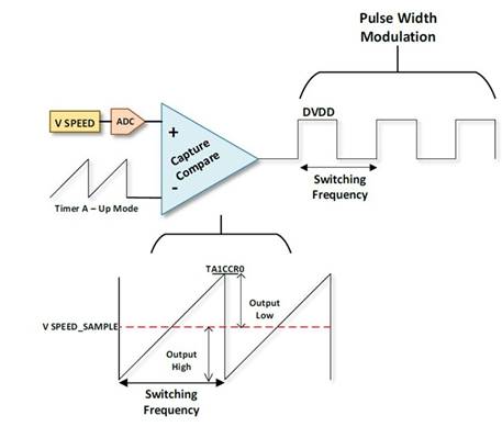 用于控制電機(jī)的PWM信號是使用MSP430G2553產(chǎn)生的。通過取樣速度電位器的滑動電壓并將該樣本與Timer_A進(jìn)行比較MSP430的PWM信號具有不同的占空比和恒定的開關(guān)頻率創(chuàng)建。