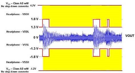 這種電源電壓為自適應型。它在高音量音頻信號時升高,從而防止大峰值電壓失真,同時在小音頻峰值時下降來降低功耗。