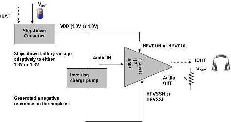 如果由于高音量音樂或者瞬態(tài)峰值音頻幅值增加,則降壓轉(zhuǎn)換器產(chǎn)生一個高 HPVDD 電壓 (HPVDDH)。HPVDD 上升速率快于音頻峰值上升時間。這樣便可防止音頻失真或削波。音頻質(zhì)量和噪聲層不受 HPVDD 的影響。這種自適應 HPVDD 在避免削波和失真的同時最小化了電源電流。由于正常的聽力水平在200mVRMS以下,因此 HPVDD 最常位于其最低電壓 HPVDDL。所以,相比傳統(tǒng)的 AB 類耳機放大器,G 類放大器擁有更高的效率。 |