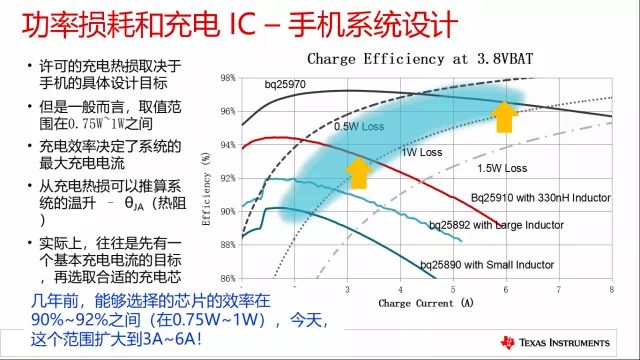 從TI的芯片數(shù)據(jù)來(lái)看,早一代芯片產(chǎn)品是黃色線條,新產(chǎn)品是藍(lán)色線條?梢钥吹,效率差,損耗會(huì)更高,如果效率提高2.5%,在同等的熱損要求下,電流提升可以達(dá)到27%。即基本上1%的效率提升能夠允許10%的電流提升。提高效率,能較大幅度的提升許可充電電流上限,從而帶來(lái)更大的充電設(shè)計(jì)自由度!