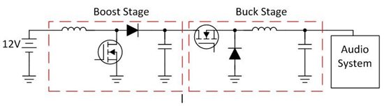 假設(shè)我們正在設(shè)計(jì)一款由12V鉛酸電池直接供電的12V汽車音響系統(tǒng)。如何使音響系統(tǒng)保持恒定的輸入電壓?記住,如上所述,電池電壓的波動(dòng)范圍可達(dá)3V至16V。降壓轉(zhuǎn)換器有用嗎?不行。當(dāng)電池電壓低于12V時(shí),音響系統(tǒng)的輸入將下降,可能會(huì)導(dǎo)致欠壓狀態(tài)。我們來試一下升壓轉(zhuǎn)換器。還是不行。當(dāng)電池電壓大于12V時(shí),音響系統(tǒng)的輸入將上升,可能導(dǎo)致過電壓狀態(tài)并損壞電子設(shè)備。我們需要的是降壓 - 升壓轉(zhuǎn)換器。顧名思義,無論輸入電壓如何,該拓?fù)涠伎梢越祲夯蛏龎旱椒(wěn)定的輸出電壓。最重要的是,即使電壓波動(dòng),它也能提供恒定的能量。圖2所示為降壓拓?fù)涞暮唵渭?jí)聯(lián)升壓。