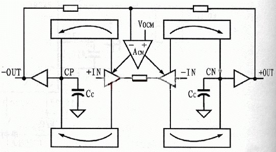 AD8137含內(nèi)部共模參考電壓的共模電路以及偏置關(guān)斷電路,其原理框圖如圖2所示。AD8137的輸入跨導(dǎo)部分是一個(gè)H橋,它的輸出電流鏡像到高阻結(jié)點(diǎn)CP和CN。輸出部分是傳統(tǒng)的H橋驅(qū)動(dòng)電路,帶著普通的發(fā)射裝置驅(qū)動(dòng)結(jié)點(diǎn)+OUT和-OUT。