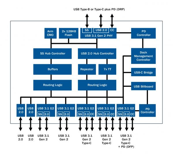 USB-C擴(kuò)展塢的設(shè)計(jì)非常復(fù)雜,需要兩個USB Hub 來實(shí)現(xiàn)內(nèi)部和外部的連接,支持 USB PD 充電的每一個USB-C端口都需要一個專用控制器,以及一個USB Billboard、USB-C橋接控制器來報告運(yùn)行狀態(tài)和連接失敗的情況。EZ-USB HX3PD Hub 控制器集成以上這些芯片的功能,從根本上簡化了系統(tǒng)的設(shè)計(jì)。此外,它還采用了12毫米×12毫米的封裝,從而減少了芯片面積。該控制器包括一個七端口 10-Gbps的 USB 3.1 Gen 2 Hub、兩個支持USB PD 3.0充電的USB-C端口以及一個支持USB Billboard 功能和安全固件下載的擴(kuò)展塢管理控制器。該控制器具備可編程特性,從而使設(shè)計(jì)人員能夠緊跟USB-C和USB PD規(guī)范的更迭,并且更好地解決相關(guān)的互操作性問題。該控制器還集成了一個可配置的USB PHY以防止USB信號的衰減,從而提高信號質(zhì)量、滿足乃至超過USB協(xié)議的要求。
