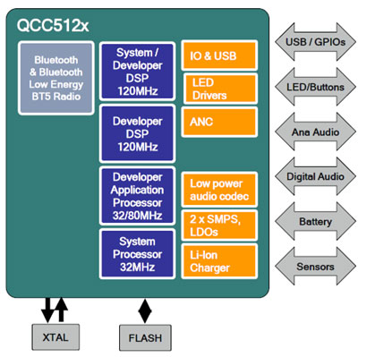 強大的四核處理器體系結(jié)構(gòu):雙核32位處理器應(yīng)用子系統(tǒng),雙核Qualcomm®KalimBA™DSP音頻子系統(tǒng),嵌入式ROM+RAM和外部Q-SPI閃存;