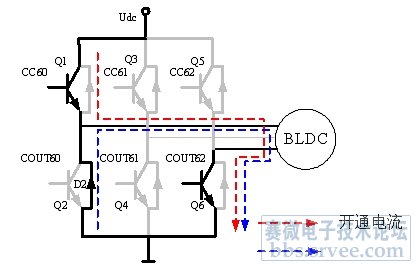 設(shè)計變頻驅(qū)動電路可有以許多不同的方式。在典型的三相電機中,最流行的低頻驅(qū)動方案是梯形波驅(qū)動電路,如圖1所示。圖2給出了梯形波驅(qū)動電路的實際測試波形。