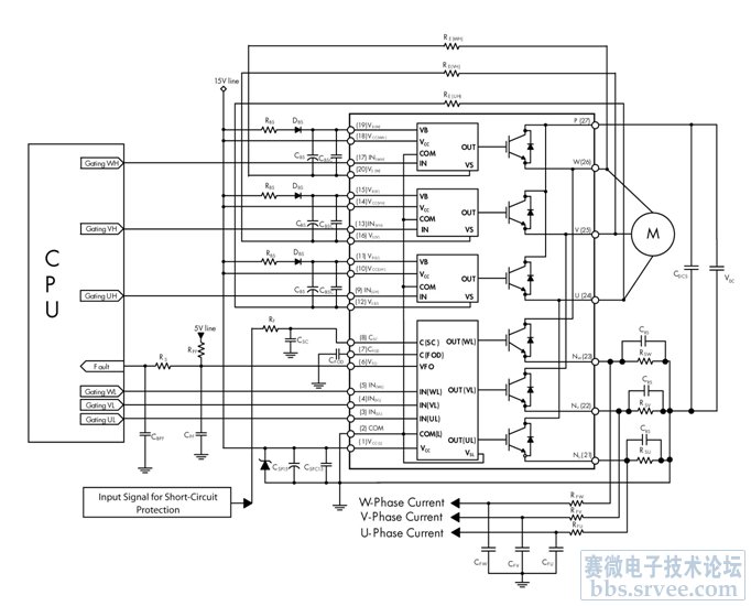 智能功率模塊(SPM)是微控制器或DSP與電機之間的功率接口,能減小電機體積并簡化設(shè)計。這種模塊較之于分立式解決方案的優(yōu)勢在于寄生電感更小、可靠性也更高,這是因為模塊內(nèi)的所有功率器件都采用了同批次芯片,具有一致的測試性能。這種智能功率模塊可與微控制器低電壓TTL或CMOS輸出直接接口,并帶有保護電路。模塊內(nèi)置有監(jiān)視結(jié)溫的熱敏電阻器、防止上下橋臂直通的邏輯保護電路、死區(qū)時間控制,以及用于最大限度減少EMI等的驅(qū)動波形整形電路。在模塊中,每個驅(qū)動IC均可進行優(yōu)化,使其以最小的EMI和驅(qū)動損耗來完成功率器件的開關(guān)動作。三相驅(qū)動模塊將繼續(xù)在電器產(chǎn)品廣泛應用。圖5給出了馬達控制使用 SPM 的典型應用電路。