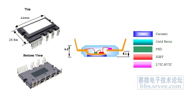圖 6為采用Mini-DIP封裝的Motion-SPM智能功率模塊的外觀和內(nèi)部結(jié)構(gòu)示意。Motion-SPM是一款超小型功率模塊,它將功率元件、上下橋臂柵極驅(qū)動器和保護電路全部集成在一個雙列直插式移模封裝件中,用于交流100~220V 等級低功耗電機驅(qū)動變頻控制。