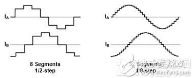 通常,步進(jìn)電機(jī)不是由模擬線性放大器驅(qū)動(dòng);而是由PWM電流調(diào)節(jié)驅(qū)動(dòng),把線性的正弦波信號(hào)轉(zhuǎn)換成了離散的直線段信號(hào)。 正弦波可被分成多段,隨著段數(shù)的增加,波形不斷接近正弦波。 實(shí)際應(yīng)用中,段數(shù)多從4到2048或更多,大多數(shù)步進(jìn)驅(qū)動(dòng)IC采用4到64段細(xì)分。整步驅(qū)動(dòng),每一時(shí)刻只有一個(gè)相通電,兩相電流交替和電流方向切換,使得一共產(chǎn)生四個(gè)步進(jìn)電機(jī)機(jī)械狀態(tài)。半步驅(qū)動(dòng),比整步驅(qū)動(dòng)方式相對(duì)復(fù)雜一些,在同一時(shí)刻,可能兩個(gè)相都需要被通電,如圖1所示,使電機(jī)的步進(jìn)分辨率提高了一倍。細(xì)分驅(qū)動(dòng),電機(jī)轉(zhuǎn)子走一步的角度將會(huì)隨著細(xì)分?jǐn)?shù)的增加而減小,電機(jī)轉(zhuǎn)動(dòng)也越來(lái)越平穩(wěn),例如把一個(gè)32段細(xì)分序列稱為八分之一步驅(qū)動(dòng)模式(見(jiàn)圖1)。