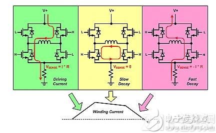 在預(yù)期的峰值電流達(dá)到后,H橋驅(qū)動(dòng)繞組的電流衰減控制方式有兩種: