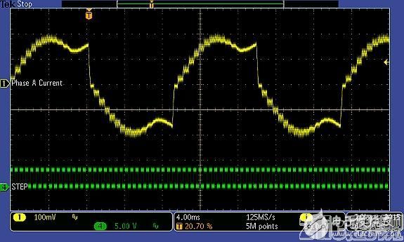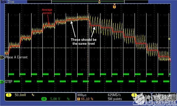 如圖4波形所示,峰值電流后一步和前一步的電機(jī)步進(jìn)不一樣,會(huì)導(dǎo)致位置誤差和瞬時(shí)速度的變化。電流過(guò)零時(shí),因?yàn)閮煞N衰減模式的切換,也會(huì)有同樣的問(wèn)題。