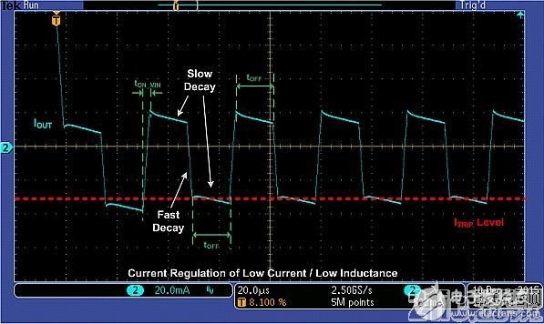 如果電源電壓高,電感值低,或所需的峰值電流幅值很低,電流很有可能高于設(shè)定值。由于blanking time,每個(gè)PWM周期都會(huì)有一個(gè)最小導(dǎo)通時(shí)間,此時(shí)許多傳統(tǒng)的步進(jìn)電機(jī)驅(qū)動(dòng)器無(wú)法控制繞組電流。如果發(fā)生這種情況,MP6500會(huì)不斷采用快衰退模式來(lái)保證繞組電流一直不超過(guò)設(shè)定值(見(jiàn)圖7)。