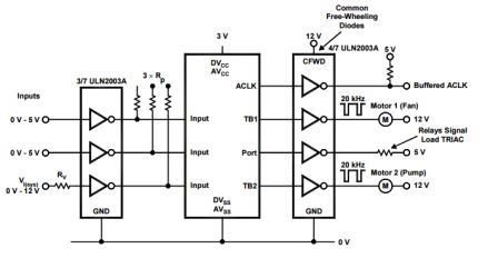 Figure 4 showcases how the MSP430 microcontroller and ULN2003A can drive a 12V logic rail along with some motors and LEDs. This works out great because the ULN2003A can handle voltages up to 50V and currents up to 500mA/channel, which gives you ample range for motors and LEDs.