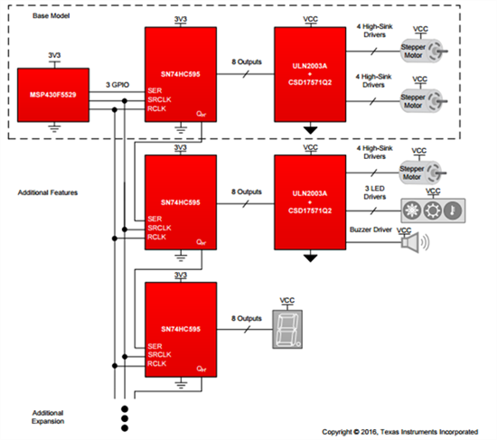 既然現(xiàn)在條件已成熟,您可連接MSP430 MCU、SN74HC595、ULN2003A和CSD17571Q2,創(chuàng)建一個(gè)靈活的電源結(jié)構(gòu),可在8通道的倍數(shù)中進(jìn)行擴(kuò)展,如圖5所示。