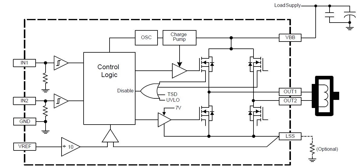 內(nèi)部電路保護(hù)包括過電流保護(hù)、電動機(jī)引腳接地短路或電源短路、帶時延的過熱關(guān)機(jī)、VBB 欠壓監(jiān)視以及交叉電流保護(hù)。