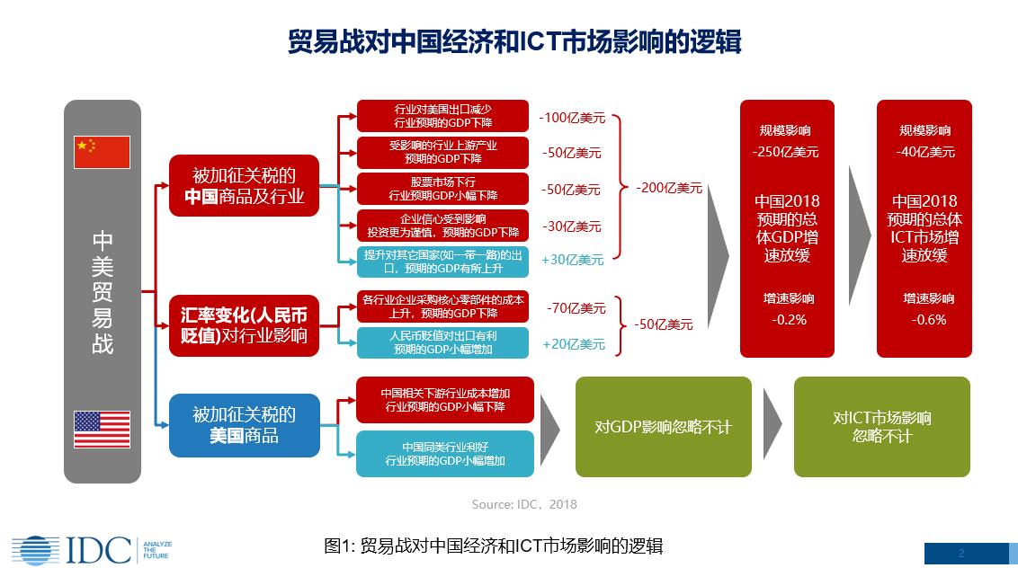 貿(mào)易戰(zhàn)對中美兩國的經(jīng)濟(jì)都將有負(fù)面影響,特別是對貿(mào)易順差巨大的中國。根據(jù)IDC的研究,基于當(dāng)前雙方各340億美元產(chǎn)品開始加征關(guān)稅,中國2018年GDP增長率將減少0.2%(原來的6.7% 到影響后的6.5%),影響的GDP總額約250億美元(1US$=6.7 RMB)。中國2018年總體ICT市場增長率將減少0.6%(原來9.0%到影響后的8.4%),影響的ICT市場規(guī)模約40億美元。