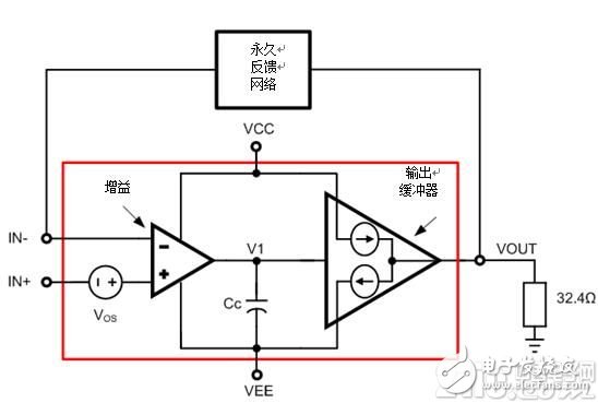 圖1是驅(qū)動耳機負載的運算放大器的簡化框圖。它包括兩個級——一個增益級和一個輸出緩沖器,以及一個補償電容器、Cc和一個補償電壓,Vos。如圖所示,輸出緩沖器是一個單位增益級,能夠吸收電流和提供電流。