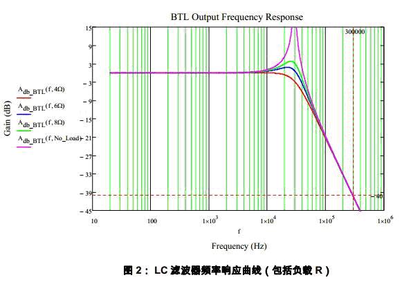 該例子中L=15uH,C=1uF,截止頻率Fn約為29kHz,在Class D 的開關(guān)頻率(約300kHz)位置提供-40dB 的衰減。在截止頻率處,不同的負(fù)載阻抗呈現(xiàn)出不同的增益。理論上空載極端情況下增益為無限大,LC 進(jìn)入諧振狀態(tài)。
