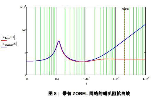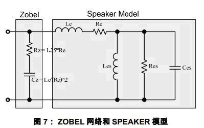 實(shí)際喇叭的高頻阻抗因?yàn)榫圈電感而呈現(xiàn)隨頻率增高而上升的趨勢,由此導(dǎo)致了LC濾波網(wǎng)絡(luò)的高Q值。ZOBEL是和喇叭并聯(lián)的阻容網(wǎng)絡(luò),它可以用來補(bǔ)償喇叭的感性而抑制喇叭阻抗的抬升。如圖7所示,ZOBEL網(wǎng)絡(luò)有電阻和電容組成。計(jì)算公式為(參見引用3):