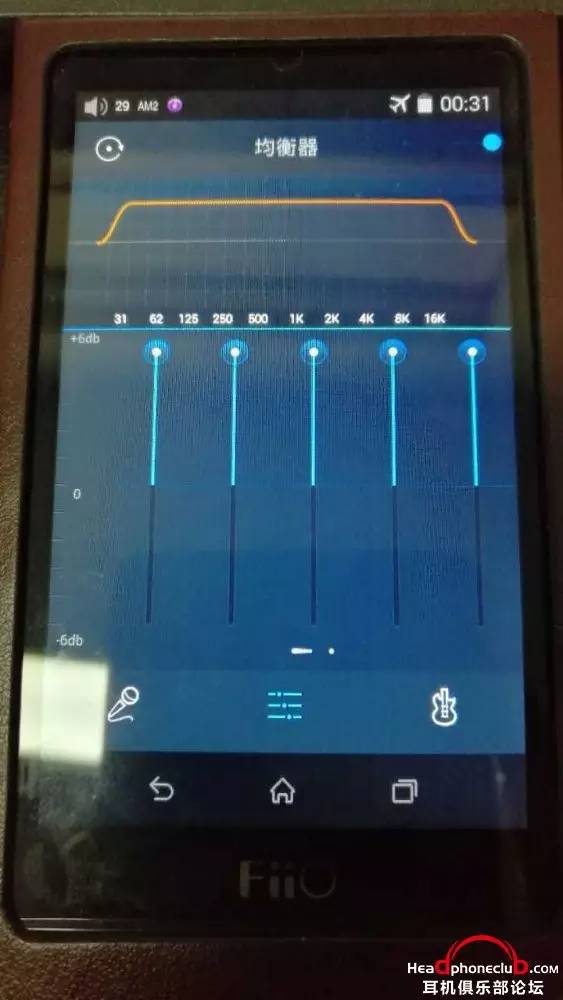 見下圖飛傲X7的EQ調(diào)節(jié),我將所有的頻域(每高八度即頻率翻倍)都統(tǒng)一調(diào)到+6db,這里你簡(jiǎn)單看成+6分貝音量吧,按理說這個(gè)EQ效果就是音量調(diào)小6db時(shí)也獲得打開EQ之前相同的聽感,而且31Hz以下和16000Hz以上應(yīng)該是明顯的滾降,實(shí)際卻是低頻量增加了,高頻也明顯變亮了。因此我不太相信這些播放器的數(shù)字EQ算法了,不過相應(yīng)的調(diào)節(jié)臨時(shí)彌補(bǔ)下聽感還是可行的。