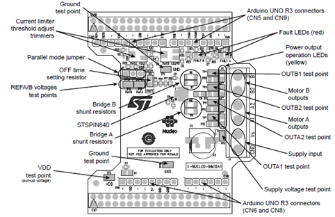 圖5.馬達(dá)驅(qū)動擴(kuò)展板X-NUCLEO-IHM15A開關(guān)和連接器位置圖