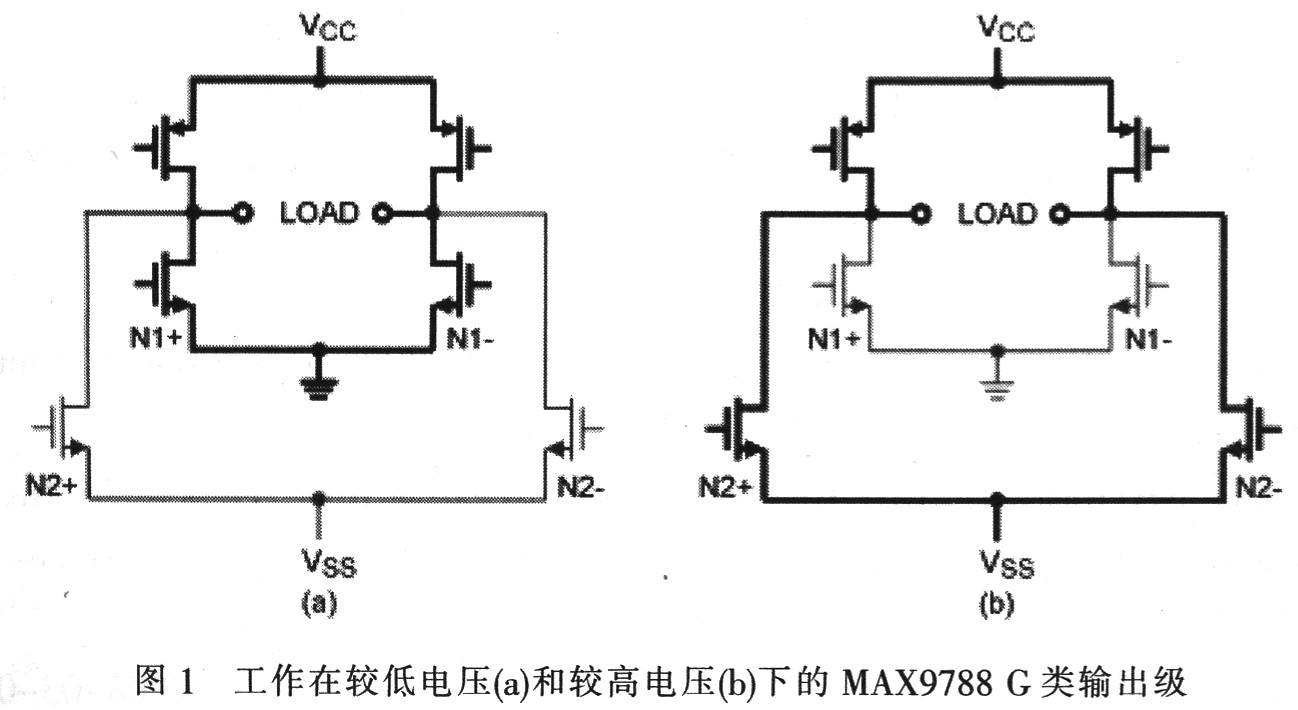 G類放大器MAX9730和MAX9788則以獨特的方式利用G類技術,它們由電荷泵產(chǎn)生負壓,而非高、低正電源。當放大器產(chǎn)生較小的輸出信號時,放大器由電池電壓和地作為供電電源。這種模式下,器件的工作方式與常見的5 V AB類放大器(圖1a)類似。當輸出信號超出電源電壓時,放大器選擇電池電壓和負電荷泵輸出供電(圖1b)。由此,G類放大器的輸出信號遠遠高于傳統(tǒng)放大器的信號。