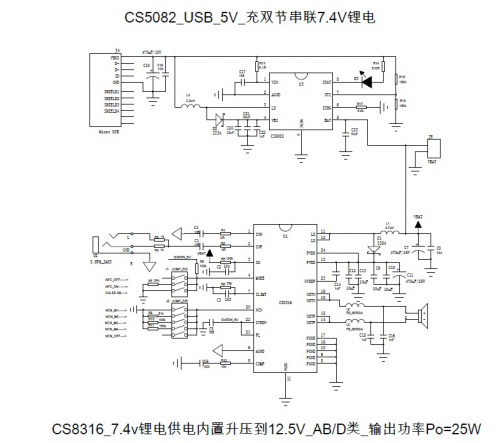 CS8316+CS5082組成5V USB輸入、雙節(jié)鋰電池串聯(lián)應(yīng)用、升壓充電實(shí)現(xiàn)25W恒定功率輸出完整解決方案,典型原理圖如下: