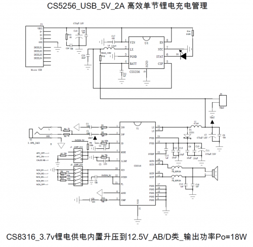 另外,CS8316也支持3.7V單節(jié)鋰電池輸入,升壓到12.5V,實(shí)現(xiàn)18W恒定功率輸出。搭配CS5256同步DC-DC降壓高效2A電流充電管理完整解決方案,典型原理圖如下: