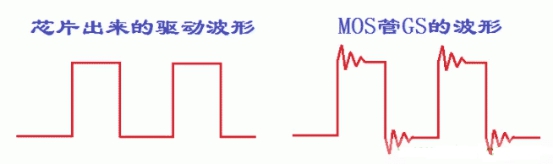 我們測(cè)死MOS管GS波形時(shí),有時(shí)會(huì)看到下圖中的這種波形,在芯片輸出端是非常好的方波輸出,但一旦到了MOS管的G極就出問(wèn)題了,有振蕩,這個(gè)振蕩小的時(shí)候還能勉強(qiáng)過(guò)關(guān),但是有時(shí)候振蕩特別大,看著都教人擔(dān)心會(huì)不會(huì)重啟。