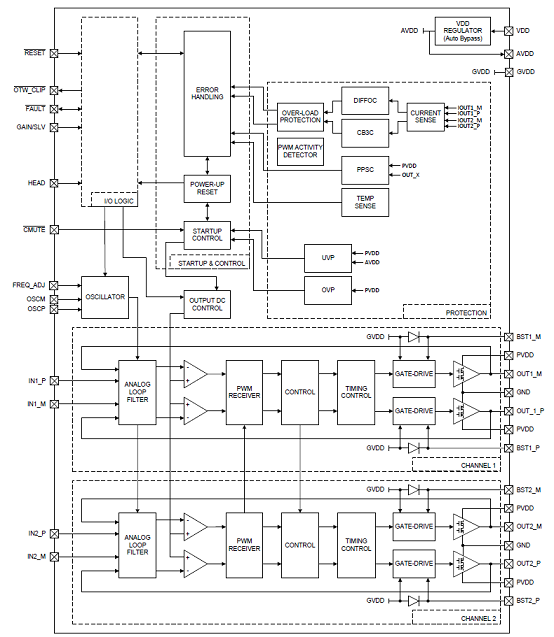 • Integrated Protection: Undervoltage, Overvoltage,Cycle-by-cycle Current Limit, Short Circuit,Clipping Detection, Overtemperature Warning andShutdown, and DC Speaker Protection