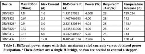 表 1 最大額定電流的不同功率級對比得到的功耗。這些器件均為單H橋,因此需要兩個來控制一個步進馬達。