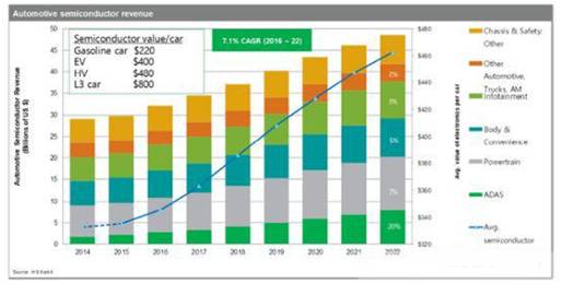 據(jù)HIS Markit的預(yù)測(cè),2016-2022年車載半導(dǎo)體的市場(chǎng)增長(zhǎng)率是年平均7.1%,車載MCU的統(tǒng)合在穩(wěn)步發(fā)展,傳感器組合在多樣化地增長(zhǎng)。