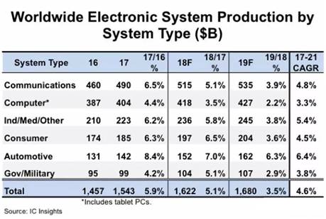 IC Insights市場分析師指出,今年汽車電子系統(tǒng)的銷售額預(yù)計將成長7%,達(dá)到1,520億美元,2019年將再成長6.3%,達(dá)到1,620億美元。該公司預(yù)計,從2017年到2021年,汽車電子系統(tǒng)銷售將以6.4%的復(fù)合年成長率(CAGR)成長,成長幅度超過其他的主要電子系統(tǒng)類別。