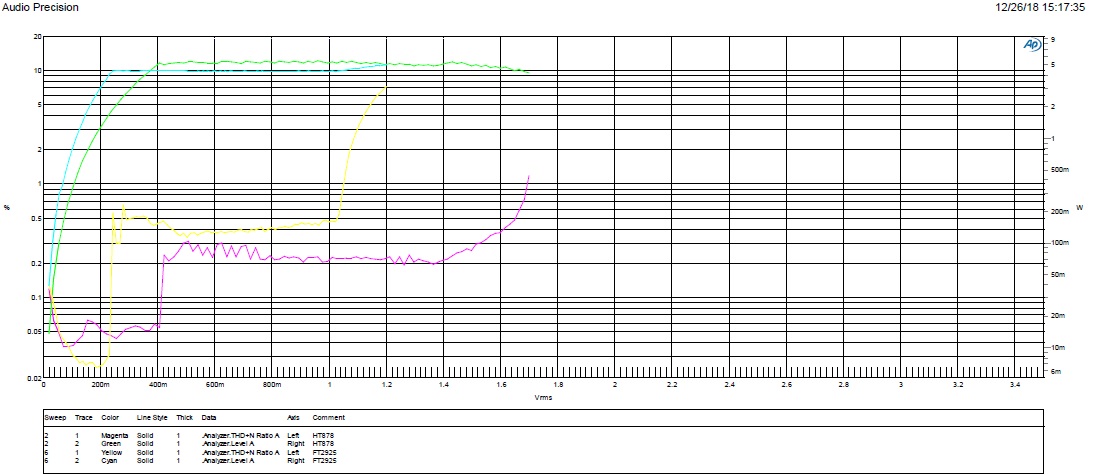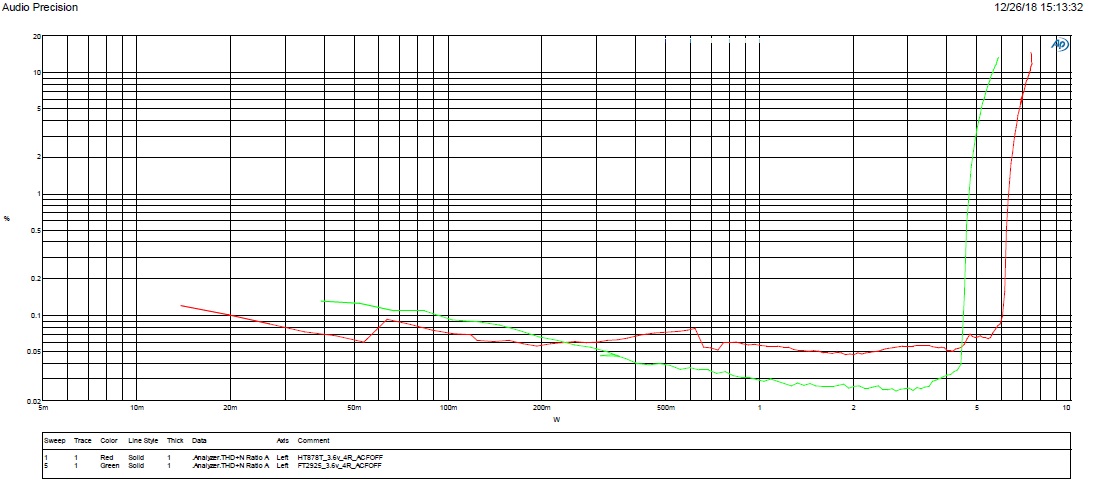 3. 整個(gè)頻段THD測(cè)試,F(xiàn)T2925低頻失真度小,HT878高頻失真度小。