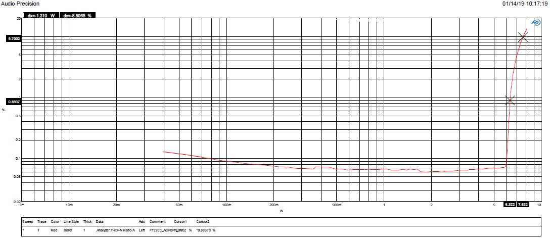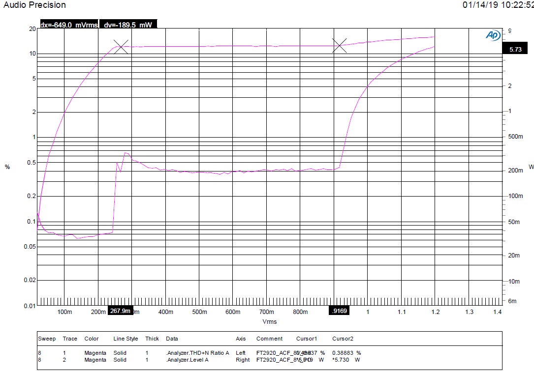 FP2920 防破音打開輸出功率:5.73W/THD=0.4%