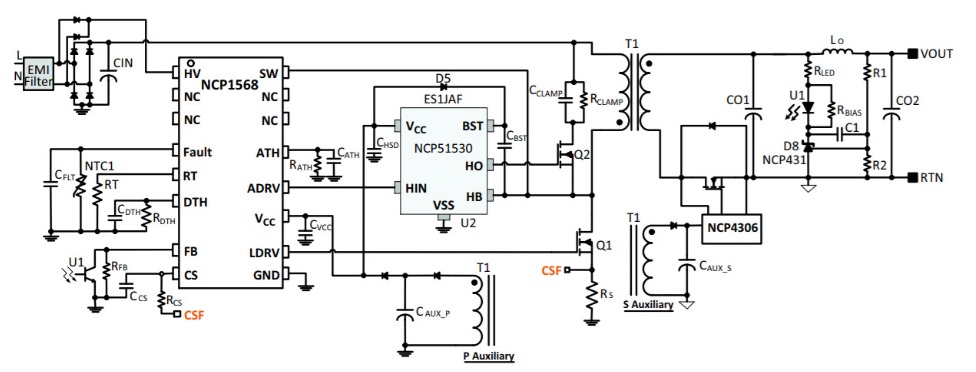 NCP1568提供智能和控制,NCP51530是集成的高、低邊驅(qū)動(dòng)器,在達(dá)700 V的電壓提供兩個(gè)N溝道功率MOSFET的高效功率開關(guān),從而在緊湊的空間實(shí)現(xiàn)高性能的電源方案。NCP51530適用于具有較短傳播延遲以及快速上升和下降時(shí)間的高頻工作。傳輸延遲(5ns)的嚴(yán)格匹配有助于提高所有應(yīng)用的能效。
