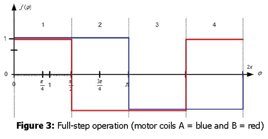 典型的步進電機有50個極(Poles),就是200個整步(Full Steps) ,也就是整步情況下每步1.8°角度,電機旋轉一周需要360°.但是也有些步進電機的步距角更小比如整步需要800步的.起初 這些步進電機被用作整步或者半步模式下,矢量電流提供給電機線圈A(藍色)和線圈B(紅色)矩形曲線圖.描述了整個一個周期360°的曲線.在圖3和圖4中很明顯看到電機線圈在90°換相點處線圈電流要么是最大電流(full power)要么是沒有電流.