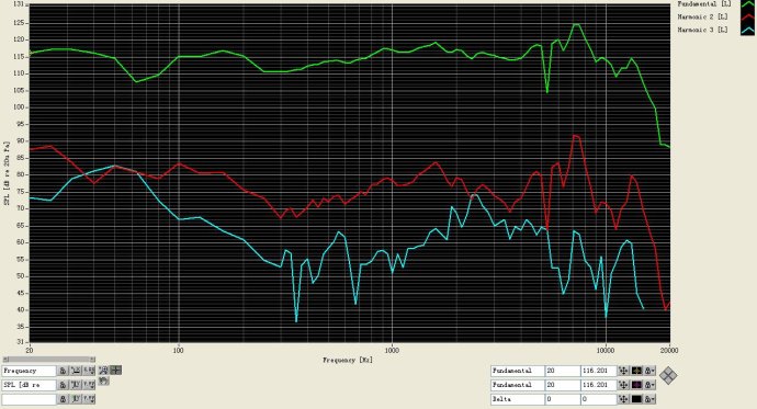 THD曲線在高頻段的“峰值”和振膜的形狀、內(nèi)阻尼等密切相關(guān)。往往在這個(gè)頻點(diǎn)上,由于高頻聲波在振膜上的傳播,導(dǎo)致了振膜上面產(chǎn)生“駐波”,進(jìn)而使得在某些頻點(diǎn),振膜的某些部位變形明顯,體現(xiàn)在指標(biāo)上,就是THD的峰值。于此對(duì)應(yīng),往往會(huì)在頻響曲線上也表現(xiàn)為峰谷,進(jìn)而影響聽感。